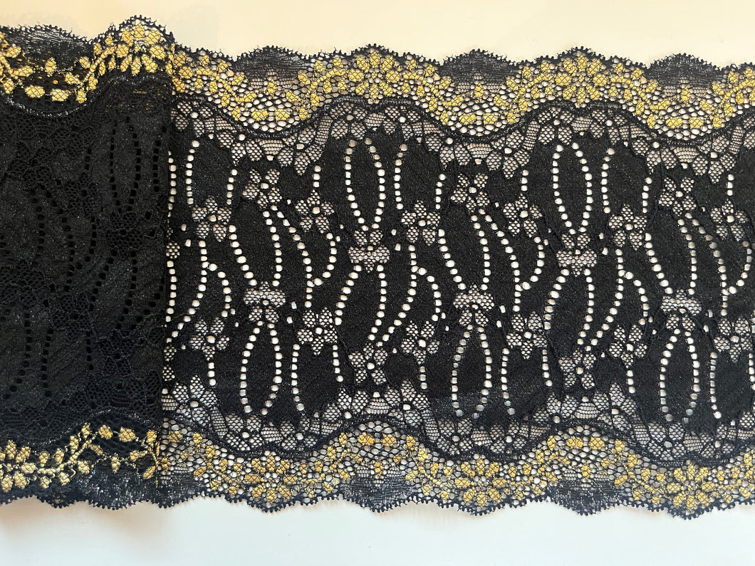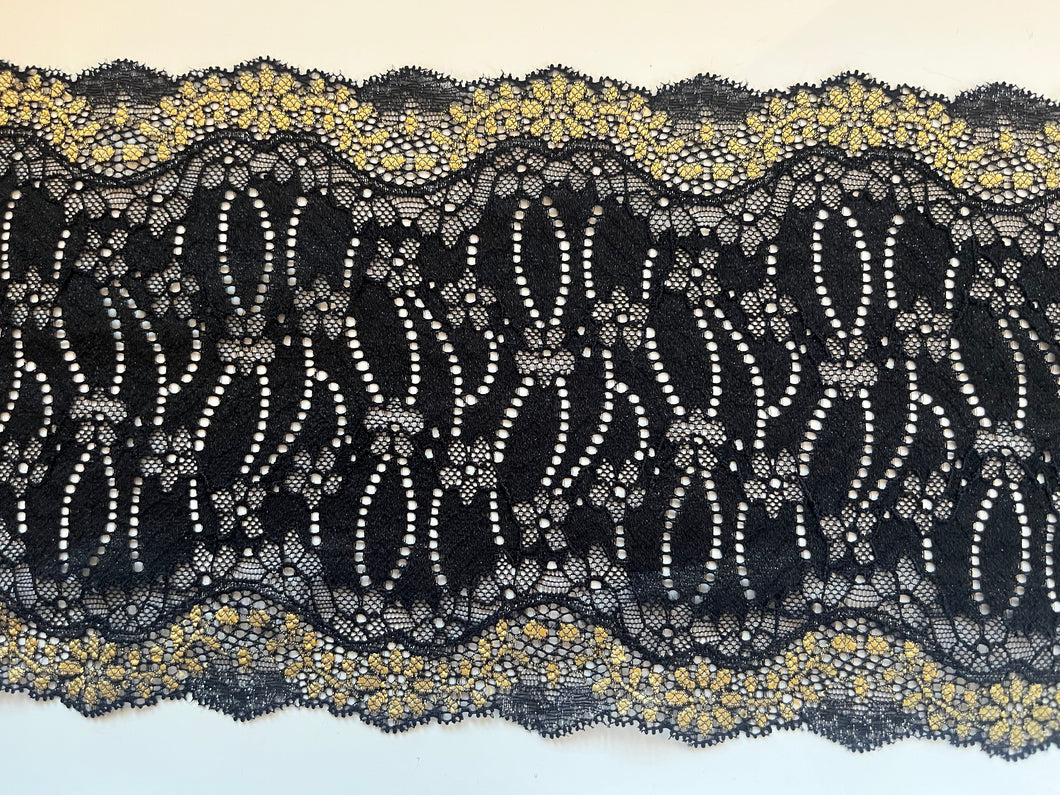 A suburb quality stretch lace made with soft yarns. It has a lovely distinct design with a gold lurex border edge and scallops to both sides.